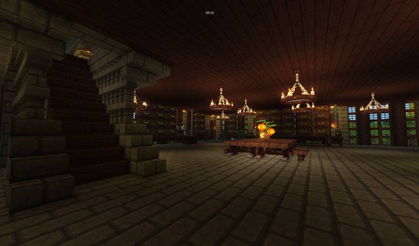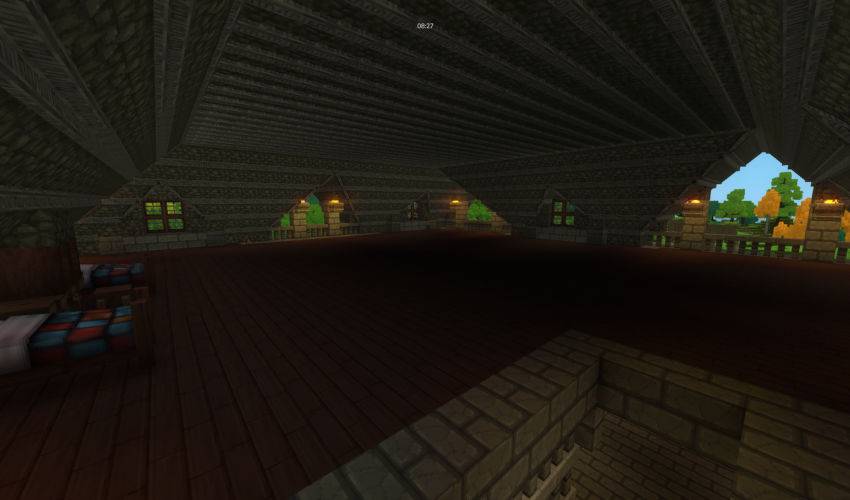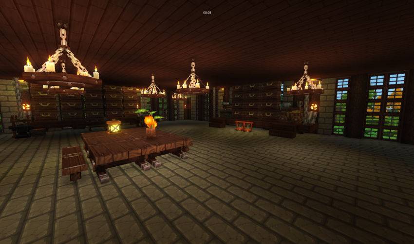 A house with workbenches, chests and stoves.