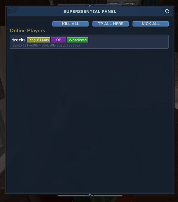 - Players: view players, heal/kill, teleport/teleport here, kick, ban, open inventory.