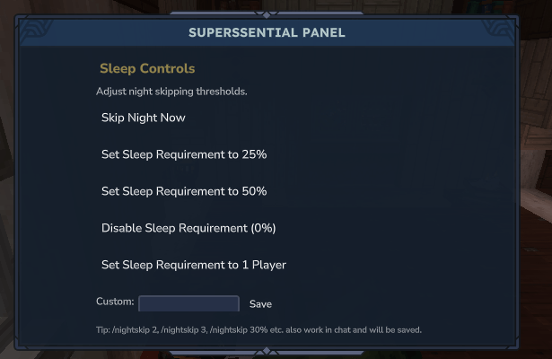 - Sleep controls: skip night, set required sleep ratio (0–100%) or player count, custom input + save; chat feedback on actions.