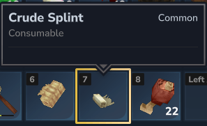 Crude Splint – Heals fractures. Can be crafted in your inventory or at a workbench.