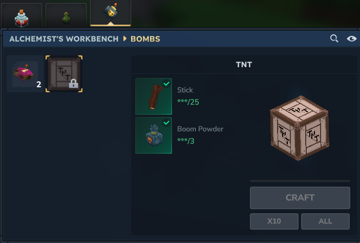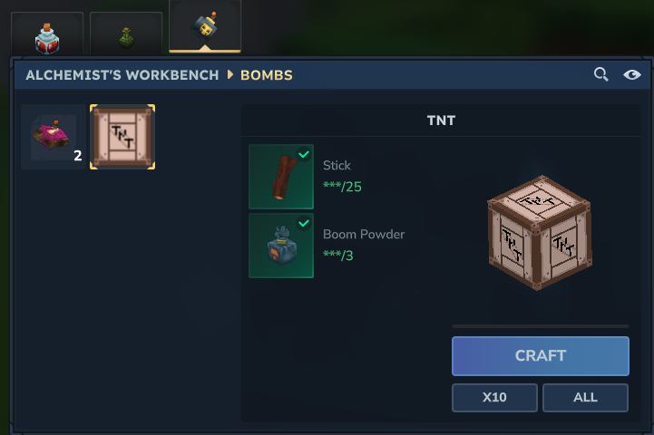 Crafting: It is a Tier 2 alchemy item crafted at the Alchemybench. The recipe requires 25 Wood Sticks and 3 Explosive Powders.