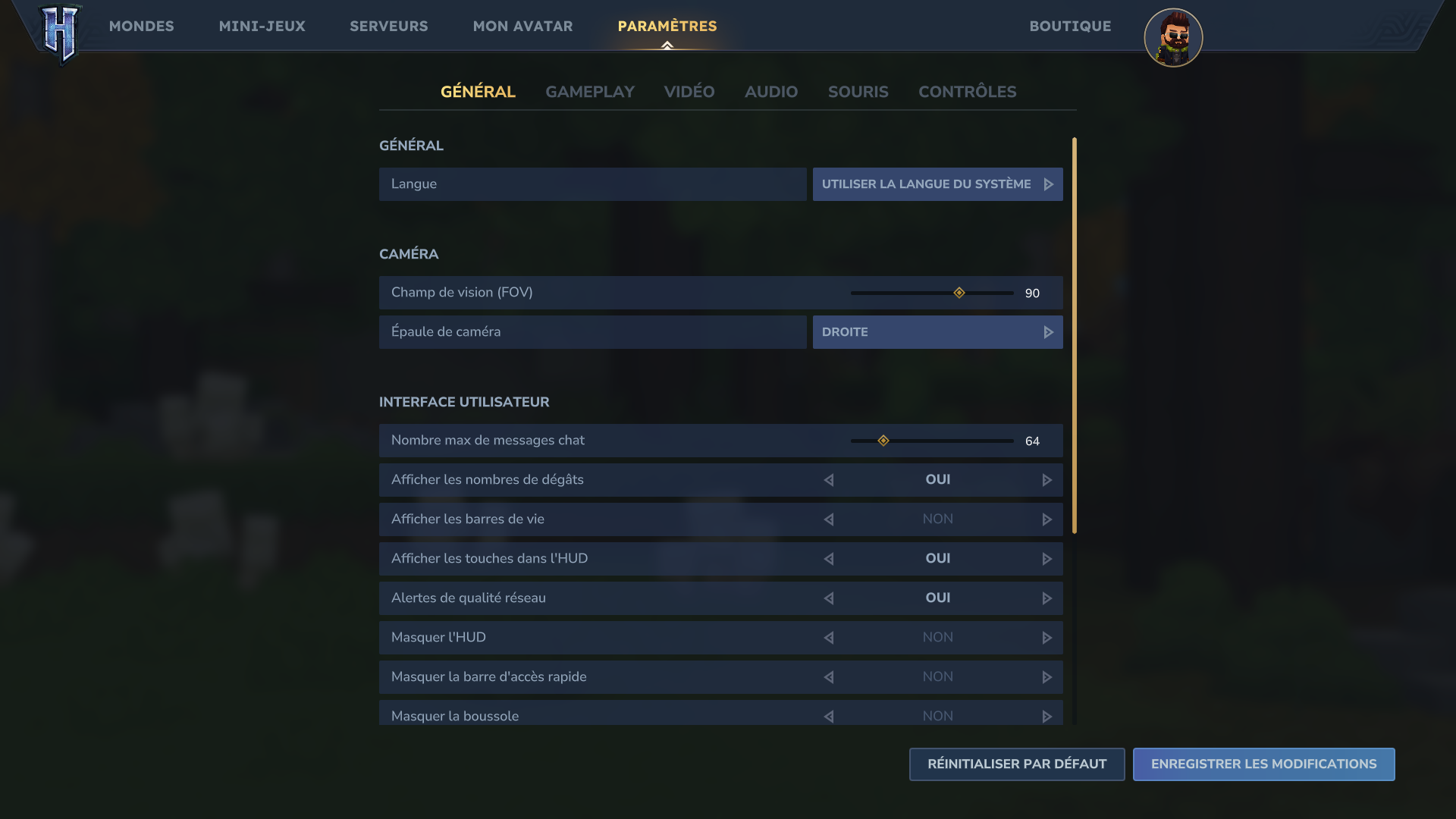 * l'intégralité du menu du jeu, paramètres du jeu и т.д.