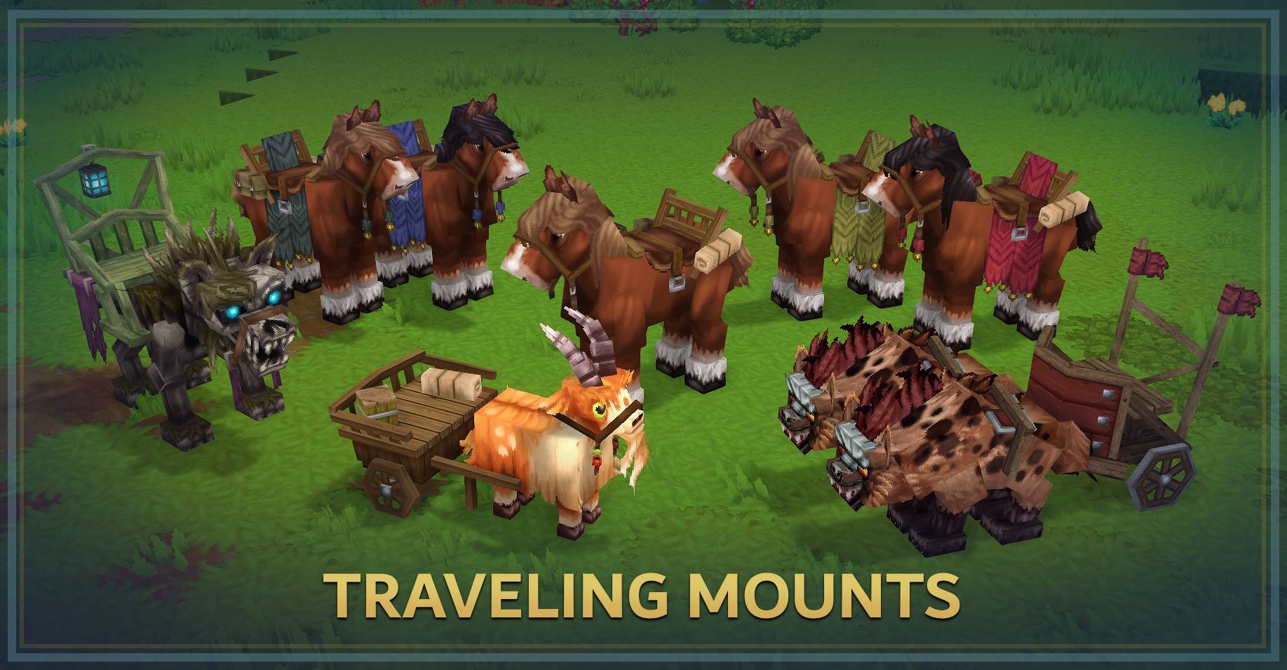 Beautifuly enhanced vanilla creature models with a variety of colors and other special mount variants, including some tamed hostile creatures. Each mount was improved in Blockbench, so they look nice and have comfy seats! I focused on gameplay imersion of traveling while sitting on the mount with a satisfying feel to it. And I love adding back rests everywhere
