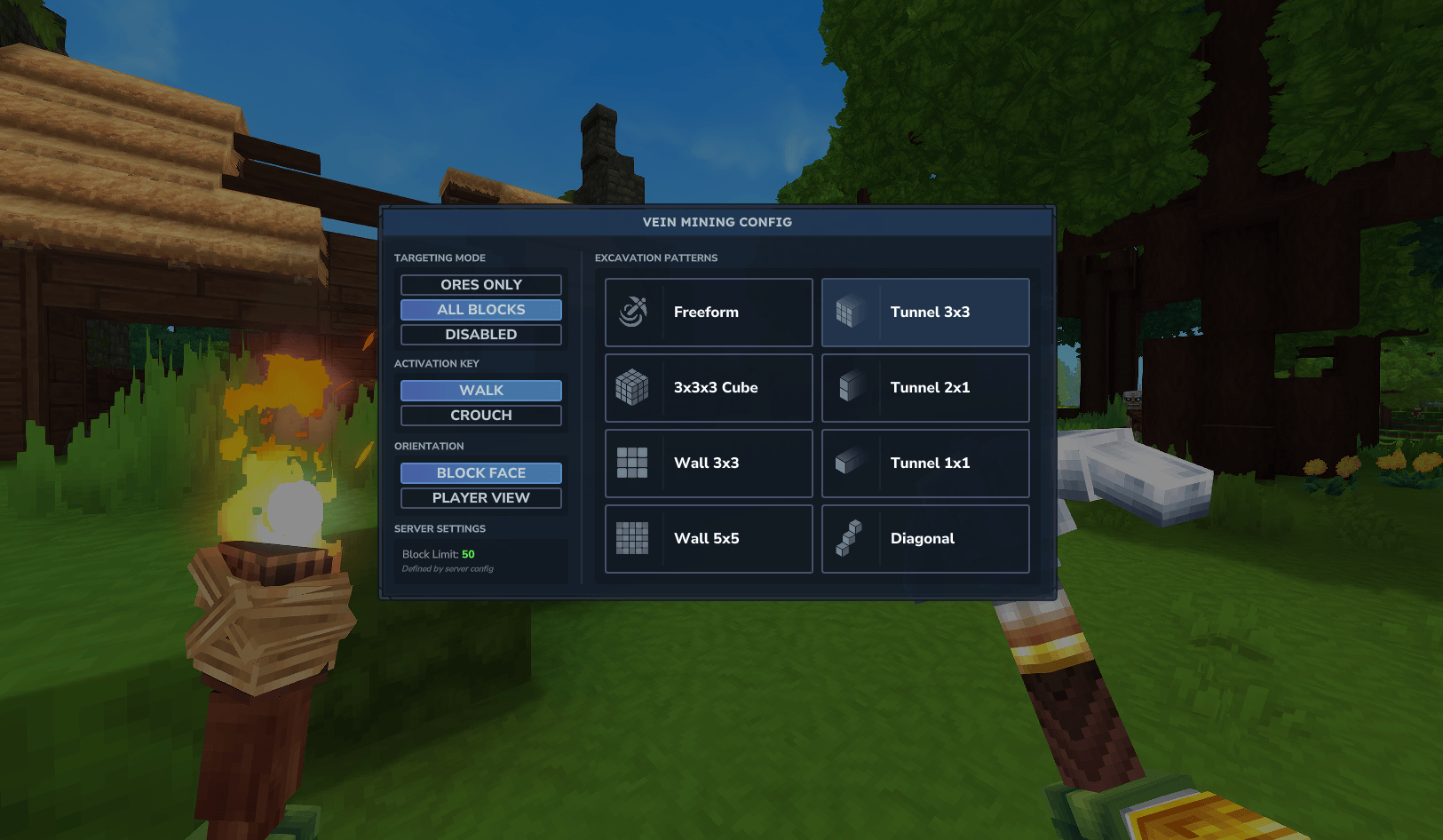 - Open the GUI with /vm or use chat commands to configure your Target Mode, Excavation Pattern, Orientation, and Key.