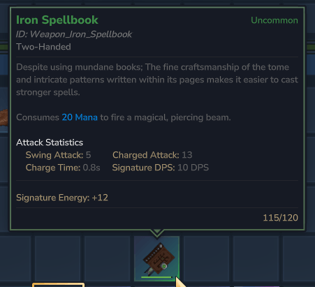 Spellbooks can accumulate Signature Energy by hitting foes, each foe hit grants 1 Signature Energy. With 12 Signature energy, you can cast Sacred Soil, a deployable zone which deals low damage over time (scales with tier of the spellbook) and inflicts a Heavy Slowing Effect to all foes.