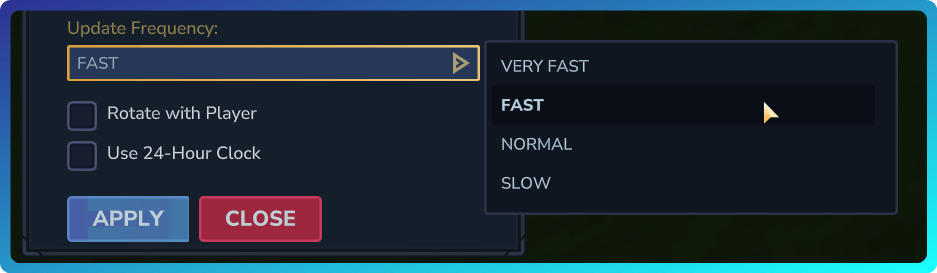 Карта | Очень быстро: 100, Быстро: 250, Нормально: 500, Медленно: 1000 | Доступные частоты обновления (имя -> миллисекунды) |