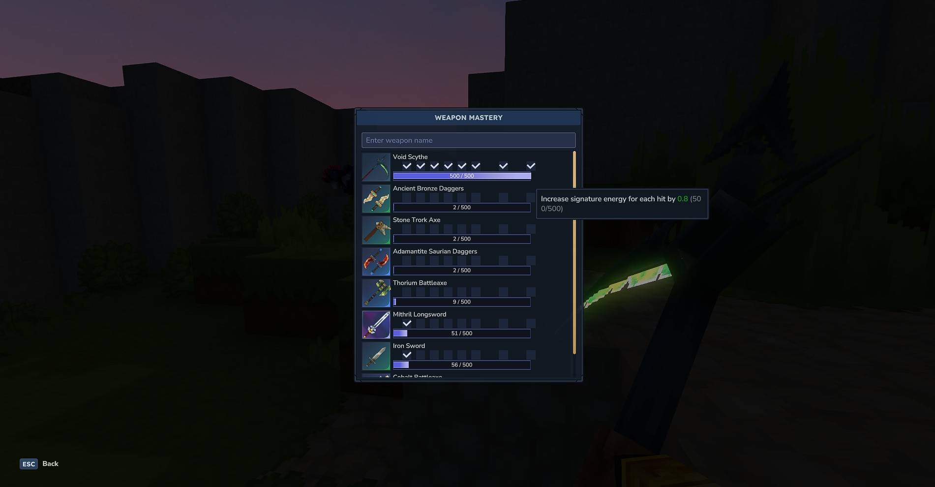Убивая существ, вы улучшите свое мастерство с помощью определенного оружия. Каждое оружие имеет собственную шкалу мастерства от 1 до 500. Чем выше мастерство, тем лучше будут бонусы и тем сложнее будет улучшить свое мастерство.