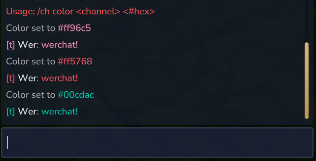 | | /ch <name> |Switch to a channel (supports partial matching) | | /ch list |List all available channels | | /ch join <channel> [password] |Join a channel | | /ch leave <channel> |Leave a channel | | /ch who <channel> |See online members in a channel | | /ch info <channel> |View channel details (owner, mods, range) | | /ch help |Show help menu | | /msg <player> <message> |Send a private message | | /r <message> |Reply to last private message | | /ignore <player> |Toggle ignoring a player | | /ignorelist |Show your ignored players |