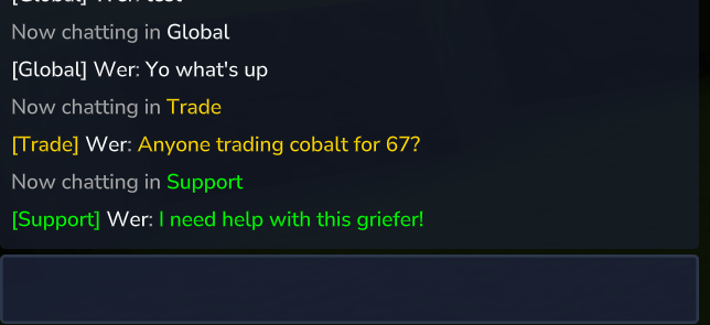 | | Global |[Global] |White |Server-wide chat (default) | | Local |[Local] |Gray |Distance-based local chat (100 blocks) | |Trade |[Trade] |Gold |Trading channel | | Support |[Support] |Green |Support/help channel |