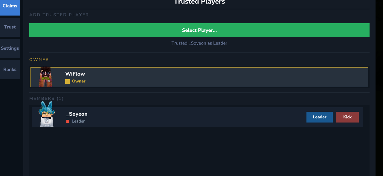 - Trust - Manage trusted players. Add from online players, change ranks, kick members.