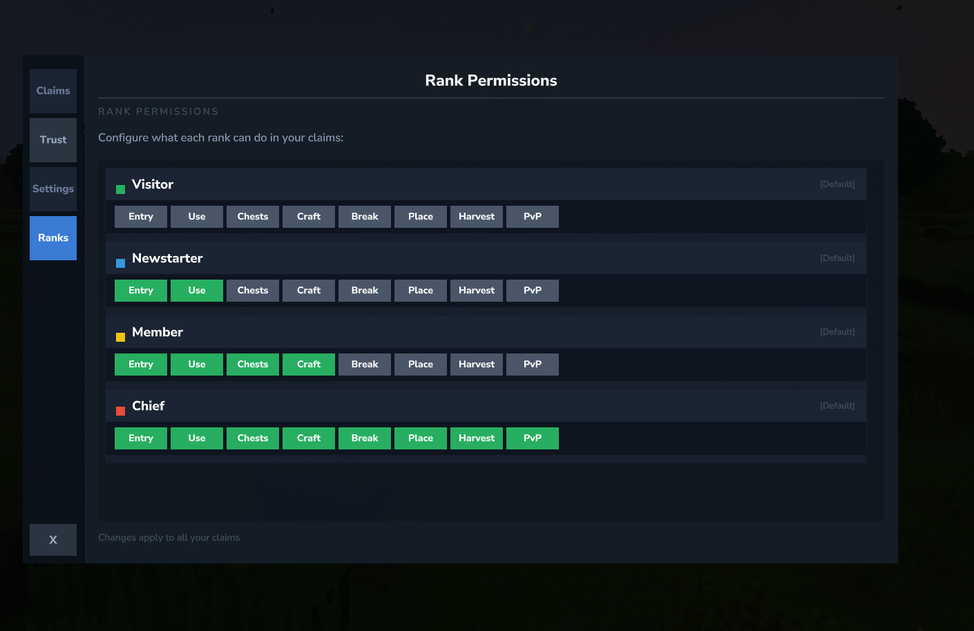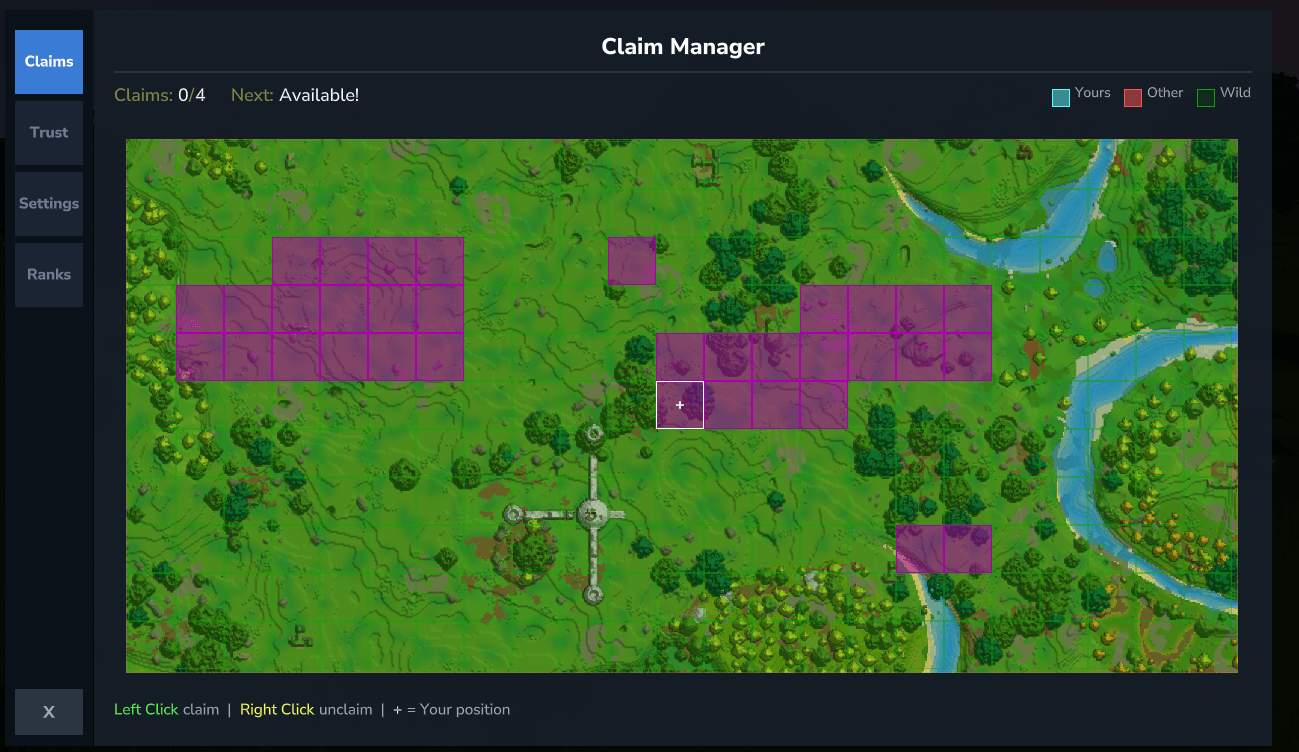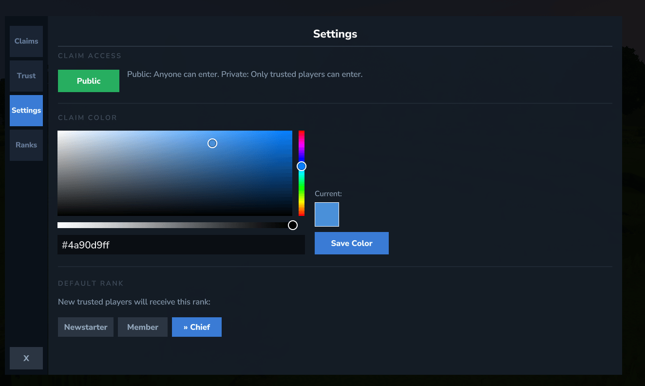 - Settings - Set claims public/private, choose your claim color for the map, set default rank for new trusted players.