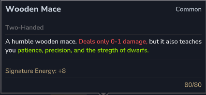 Though it deals no damage in combat. Some adventurers use it to learn patience, precision, and the stregth of a dwarf. The wooden mace proves that to become a great blacksmith you must be really brawn.