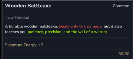 Though it deals no damage in combat. Some brave adventurers use it to learn patience, precision, and the will of a warrior. The wooden battleaxe proves that to become a mighty warrior you must have a very strong will.