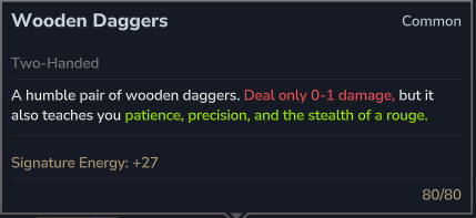 Though they deal no damage in combat. Some sneaky adventurers use these daggers to learn patience, precision, and the stealth of a rouge. The wooden daggers proves that to become a rouge you must learn the way of stealth.