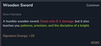 Несмотря на то, что меч не наносит ущерба в бою, он укрепляет силу, время и мышечную память. Многие искатели приключений используют его, чтобы научиться терпению, точности и дисциплине рыцаря. Деревянный меч доказывает, что мастерство начинается задолго до заточения клинка.