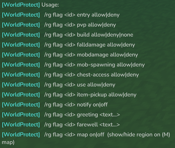 - worldprotect.flag.farewell — allows changing farewell text (/rg flag <id> farewell <text...>)